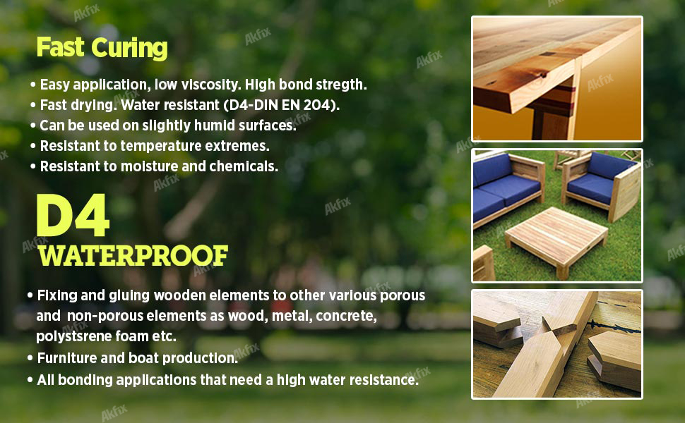 Fixarea şi lipirea elementelor din lemn de alte suprafeţe poroase şi neporoase, cum ar fi: lemn, metal, beton, polistiren etc. Ideal pentru producţia de mobilier şi ambarcaţiuni/ bărci. Toate operaţiunile de lipire unde se cere o rezistenţă mare la umiditate.