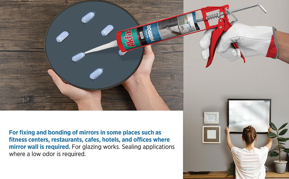 Pentru fixarea oglinzilor (în locuri precum centre de fitness, restaurante, cafenele, hoteluri, şi birouri, oriunde este nevoie de oglinzi). Lucrări de sticlărie și de montare a geamurilor. Special conceput pentru acele aplicaţii de etanşare în care se evită emanarea de mirosuri puternice.